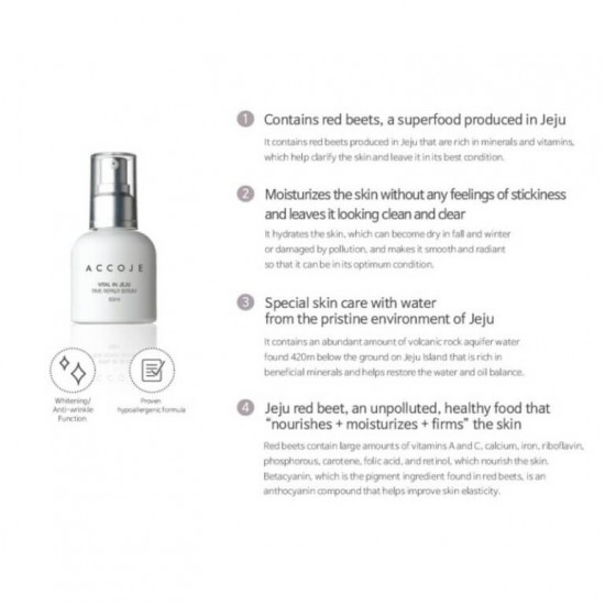 Ο ορός επανόρθωσης της κορεατικής Accoje περιέχει Red Beet, μια σούπερ τροφή που βρίσκεται στο νησί Jeju που προάγει το καθαρό δέρμα επανορθώνοντας και ενυδατώνοντας το κατεστραμμένο δέρμα, καθιστώντας το λείο και σφριγηλό.