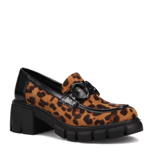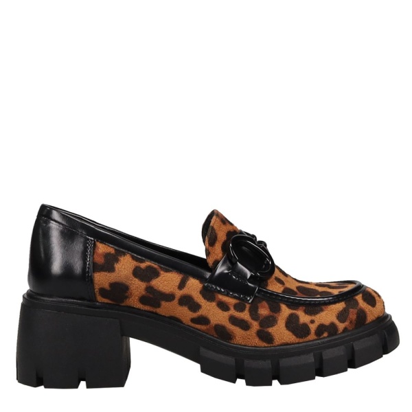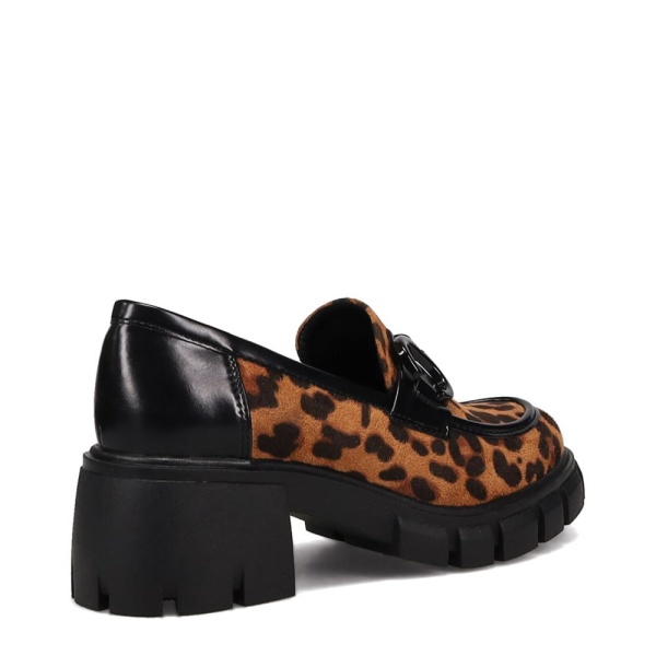 Λεοπάρ loafer με μαύρο διασκοσμητικό χαλινάρι. Διαθέτει τρακτερωτή σόλα και χοντρό τακούνι.