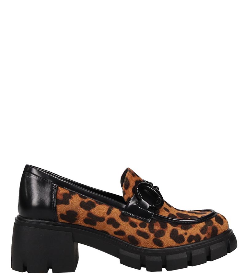Λεοπάρ loafer με μαύρο διασκοσμητικό χαλινάρι. Διαθέτει τρακτερωτή σόλα και χοντρό τακούνι.