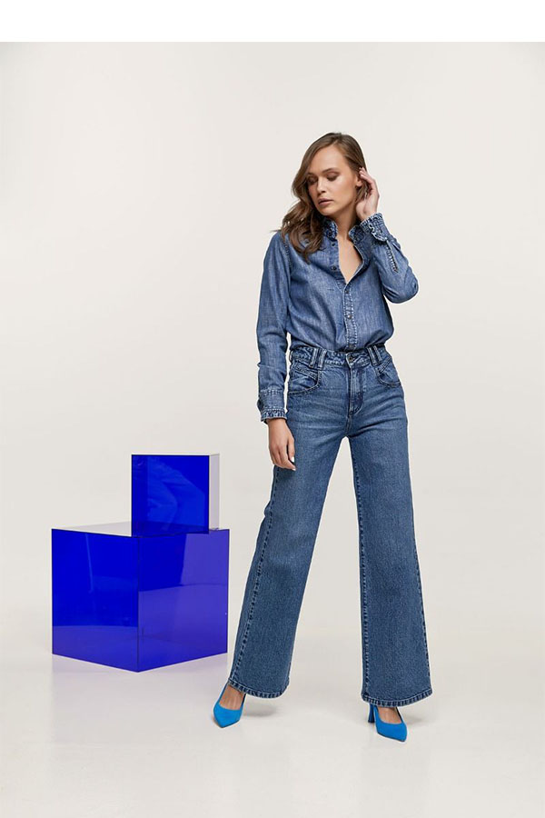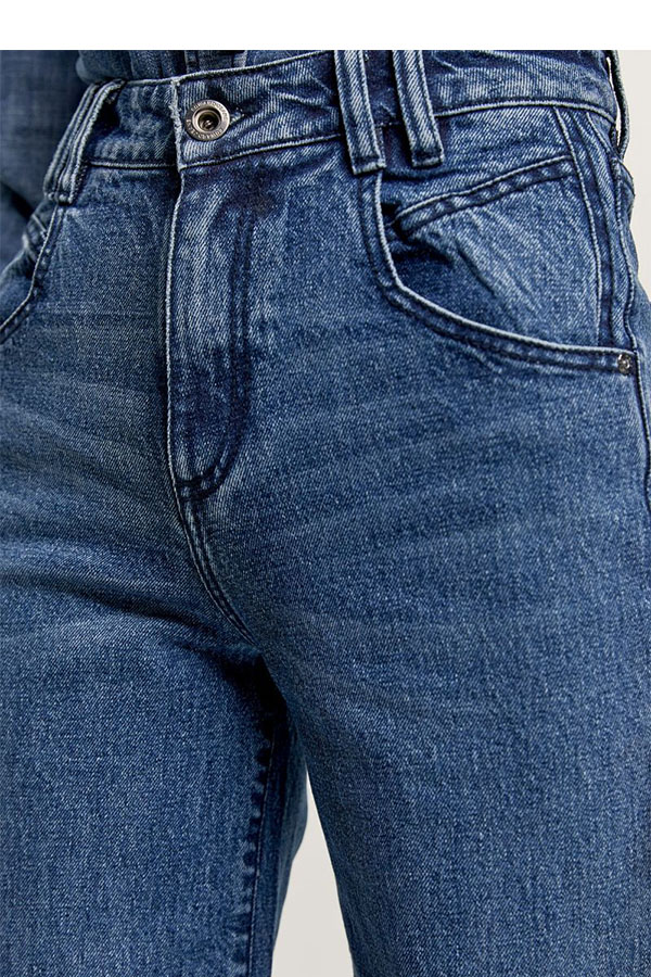 Ψηλόμεσο τζιν παντελόνι με 5 τσέπες και φαρδύ μπατζάκι. Σχέδιο με ξεβάμματα. Κλείσιμο μπροστά με φερμουάρ και μεταλλικό κουμπί.