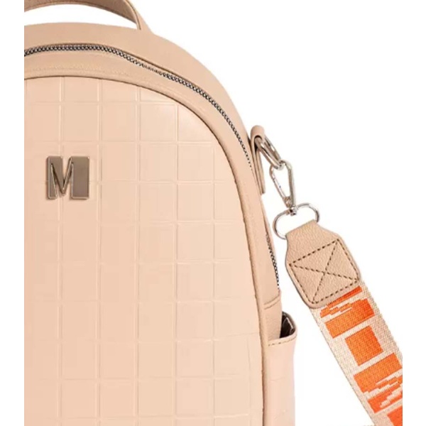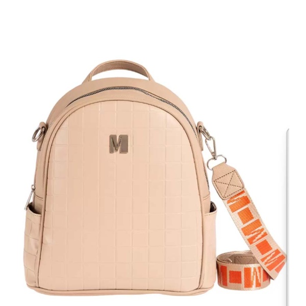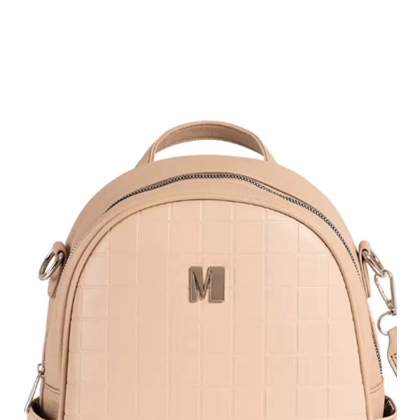 Γυναικεία τσάντα πλάτης από ανθεκτικό συνθετικό δέρμα με ανάγλυφη υφή στην μπροστινή όψη. Κλείνει με φερμουάρ και στο εσωτερικό της υπάρχουν τρία πλαϊνά βοηθητικά τσεπάκια, το ένα εκ των οποίων κλείνει με φερμουάρ. Στα πλαϊνά της υπάρχουν εξωτερικές τσέπες και στην πίσω όψη τσέπη με φερμουάρ. Περιέχει επιπλέον κοντό λουράκι από δίχρωμο ιμάντα με λογότυπο για εφαρμογή στον ώμο.