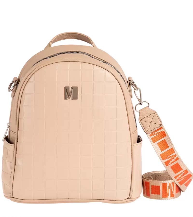 Γυναικεία τσάντα πλάτης από ανθεκτικό συνθετικό δέρμα με ανάγλυφη υφή στην μπροστινή όψη. Κλείνει με φερμουάρ και στο εσωτερικό της υπάρχουν τρία πλαϊνά βοηθητικά τσεπάκια, το ένα εκ των οποίων κλείνει με φερμουάρ. Στα πλαϊνά της υπάρχουν εξωτερικές τσέπες και στην πίσω όψη τσέπη με φερμουάρ. Περιέχει επιπλέον κοντό λουράκι από δίχρωμο ιμάντα με λογότυπο για εφαρμογή στον ώμο.