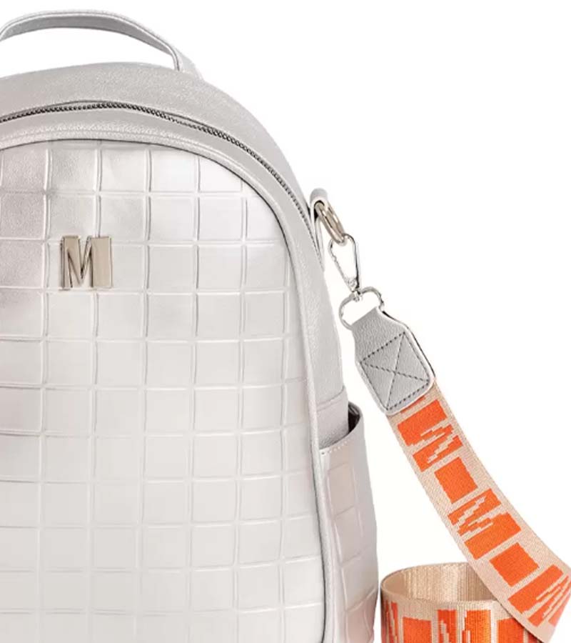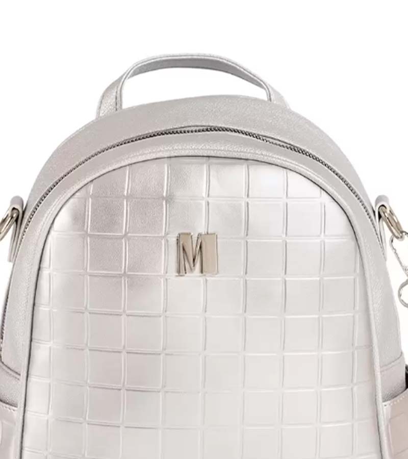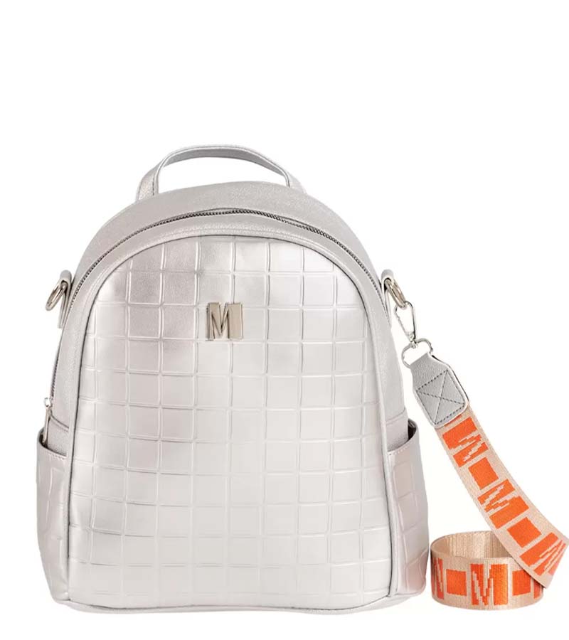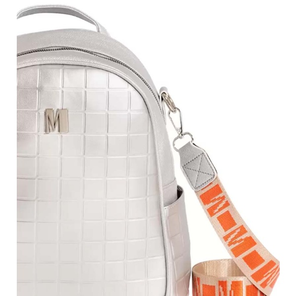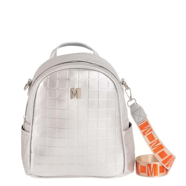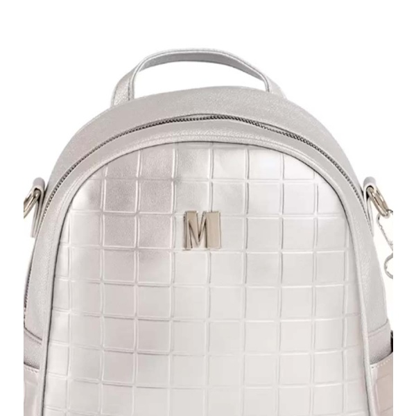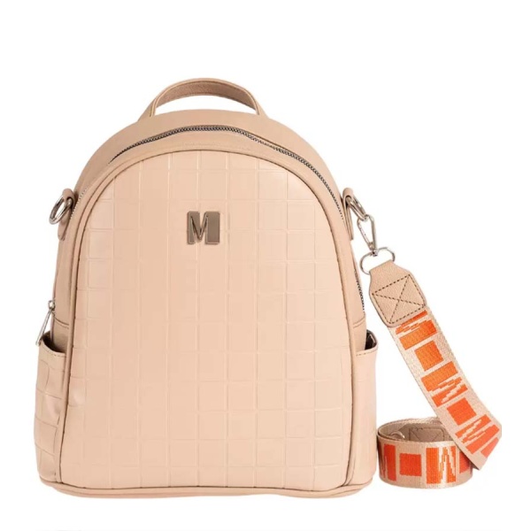 Γυναικεία τσάντα πλάτης από ανθεκτικό συνθετικό δέρμα με ανάγλυφη υφή στην μπροστινή όψη. Κλείνει με φερμουάρ και στο εσωτερικό της υπάρχουν τρία πλαϊνά βοηθητικά τσεπάκια, το ένα εκ των οποίων κλείνει με φερμουάρ. Στα πλαϊνά της υπάρχουν εξωτερικές τσέπες και στην πίσω όψη τσέπη με φερμουάρ. Περιέχει επιπλέον κοντό λουράκι από δίχρωμο ιμάντα με λογότυπο για εφαρμογή στον ώμο.