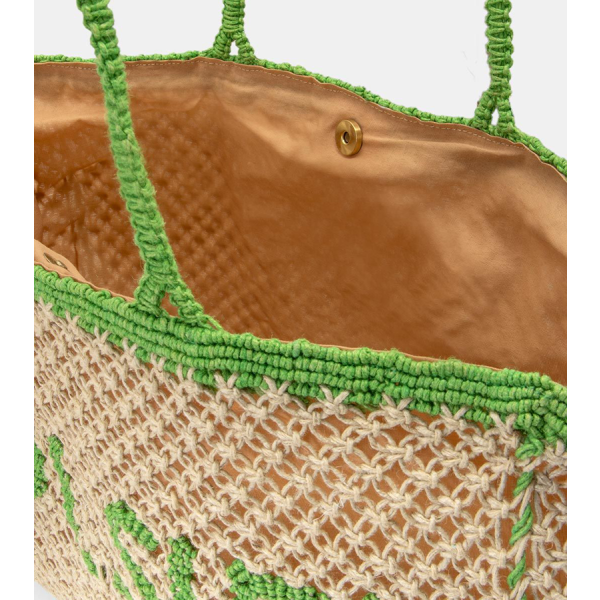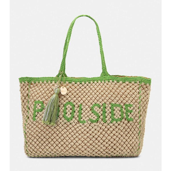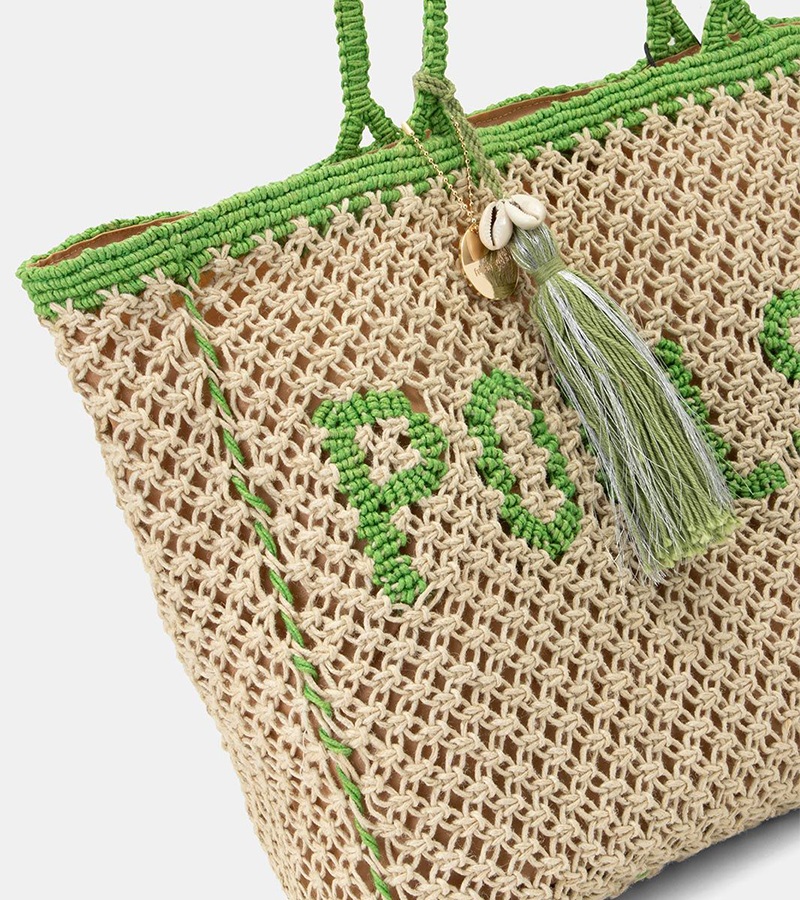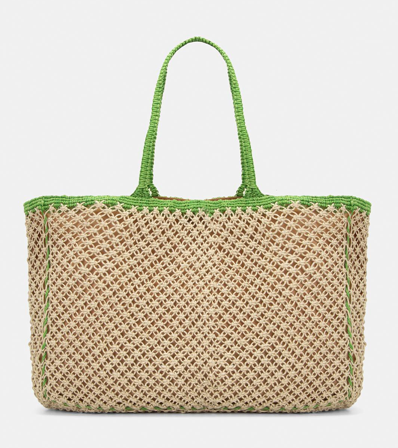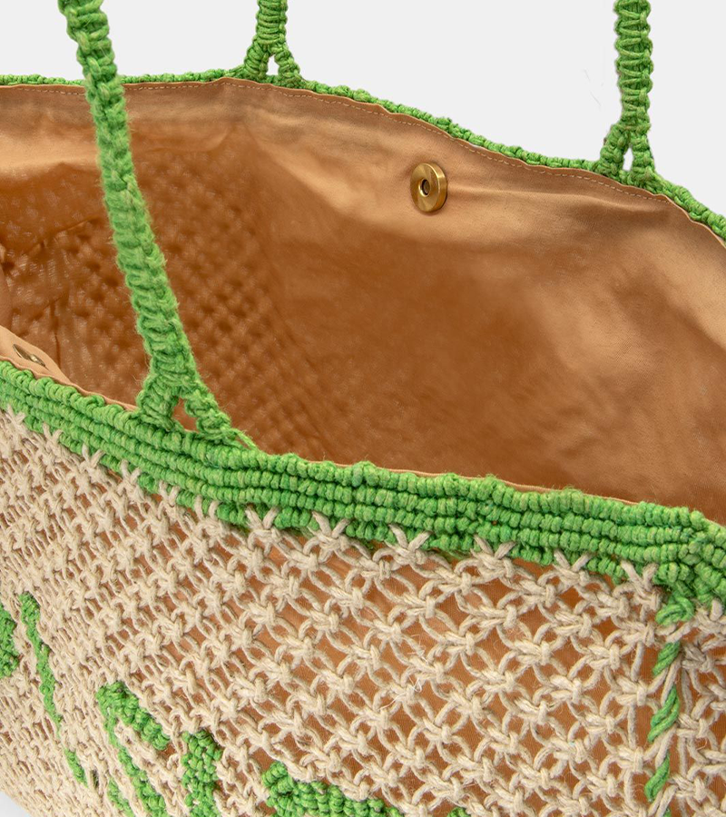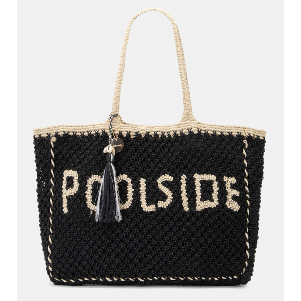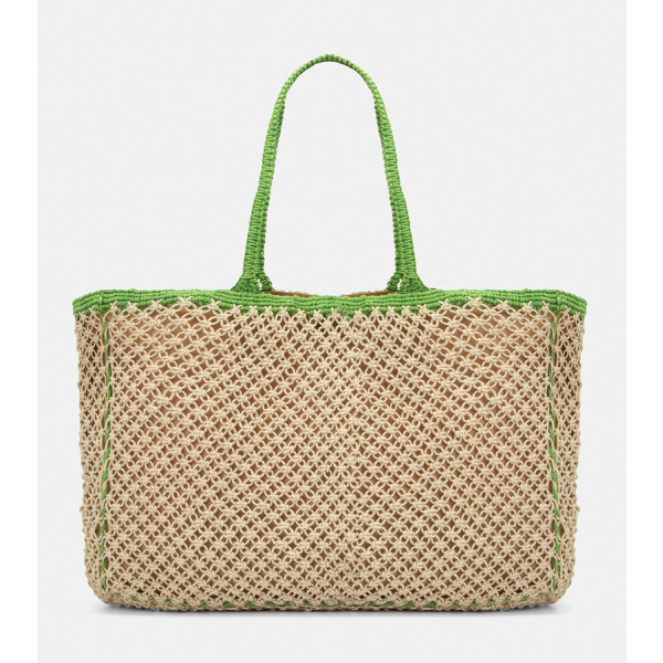 Τσάντα ψάθινη με σχέδιο δύχτι. Εφαρμογή στον ώμο με πλεκτές χειρολαβές. Κρεμαστό διακοσμητικό στοιχείο. Ενιαίος αποθηκευτικός χώρος με φόδρα. Κλείνει με μαγνητικό κούμπωμα. ΠΧΒΧΥ : 47X10X30. Σύνθεση : 100% JUTE